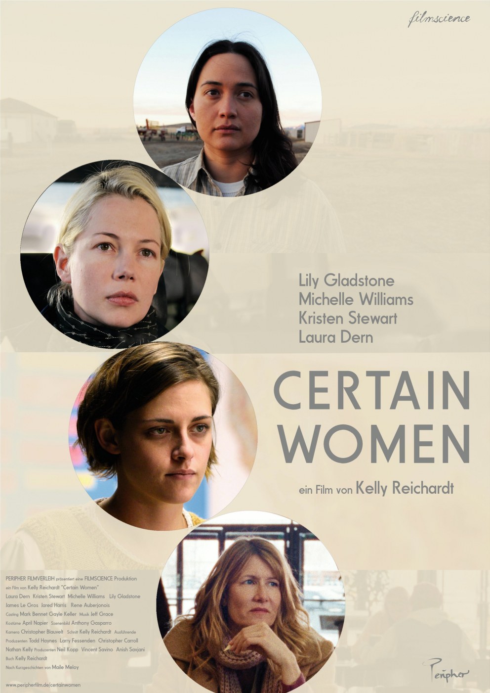 CastLaura Dern (Laura Wells), John Getz (George Rowles), James LeGros (Ryan Lewis), Rene Auberjonois (Albert), Jared Harris (Fuller), Michelle Williams (Gina Lewis), Kristen Stewart (Beth Travis), Ashlie Atkinson (Patty), James Jordan (Mac), Lily Gladstone (Jamie)RegieKelly ReichardtDrehbuchKelly ReichardtProduzentNeil Kopp, Vincent Savino, Anish SavjaniKameraChris Blauvelt